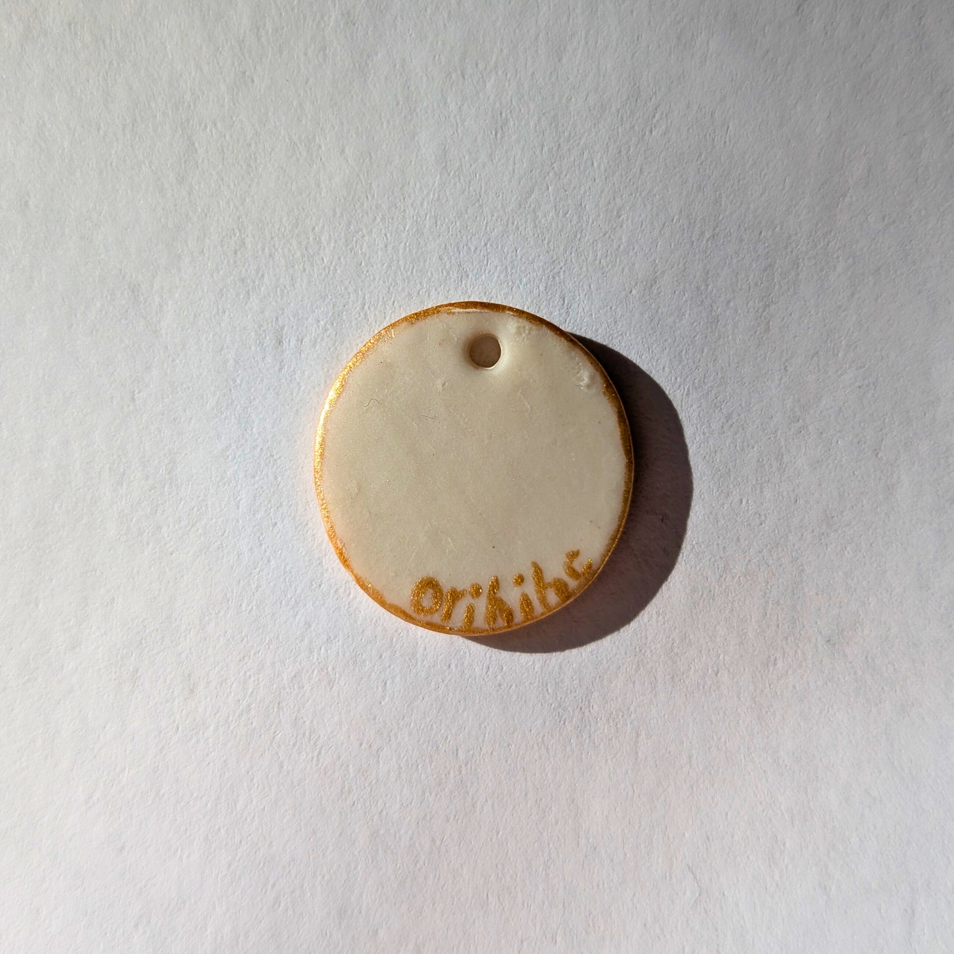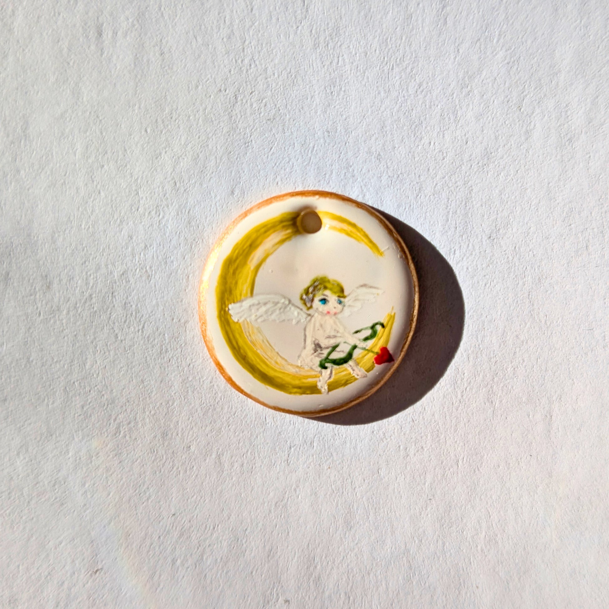 Ce pendentif en porcelaine peint à la main représente un ange délicatement assis sur un croissant de lune. Une scène poétique et céleste, symbole de douceur et de rêverie, qui apporte une touche de mystère et de lumière à votre style.