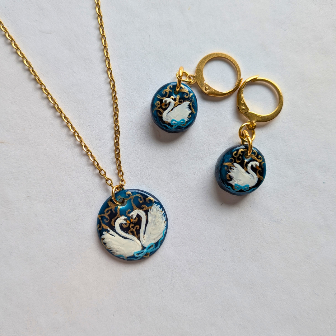 Ce pendentif en porcelaine peint à la main représente deux cygnes qui se rejoignent pour former la silhouette d’un cœur, symbole universel de l’amour et de la romance. Un délicat ruban bleu vient compléter la scène, apportant une touche de grâce et d’élégance à cette création poétique.