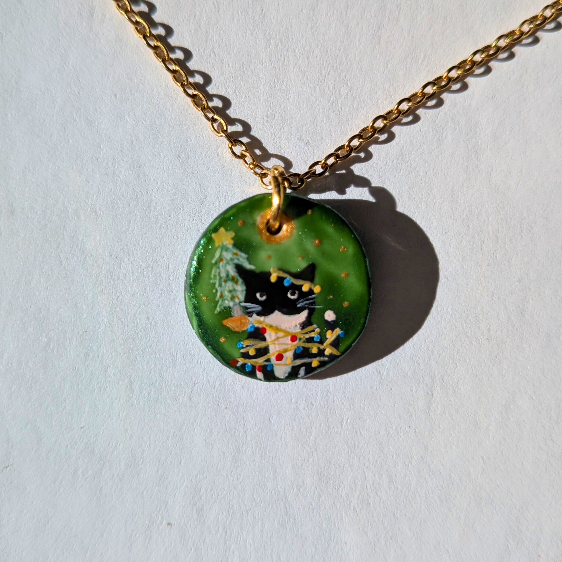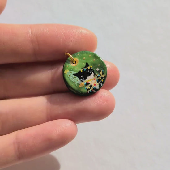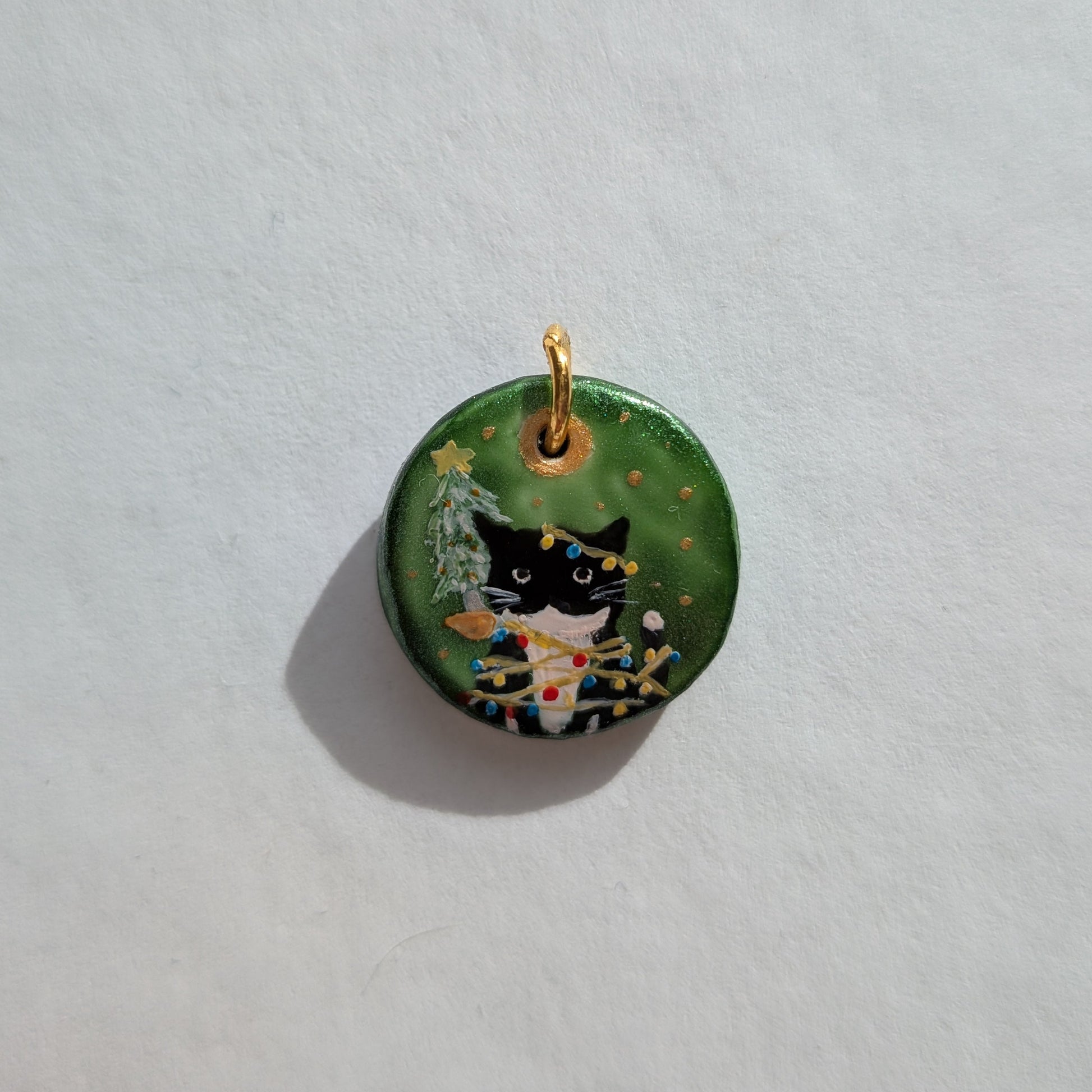Ce pendentif en porcelaine peinte à la main représente un chat blanc et noir malicieux, pris au piège dans les guirlandes lumineuses d’un sapin de Noël. Sa posture espiègle et ses détails délicatement peints rappellent les scènes amusantes et attendrissantes des fêtes d’hiver. Une pièce pleine de charme et d’humour, parfaite pour célébrer la magie de Noël avec légèreté.