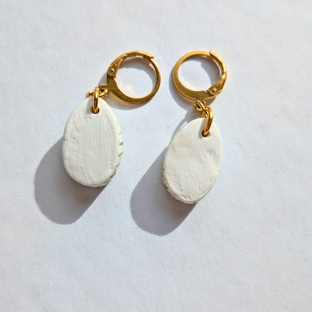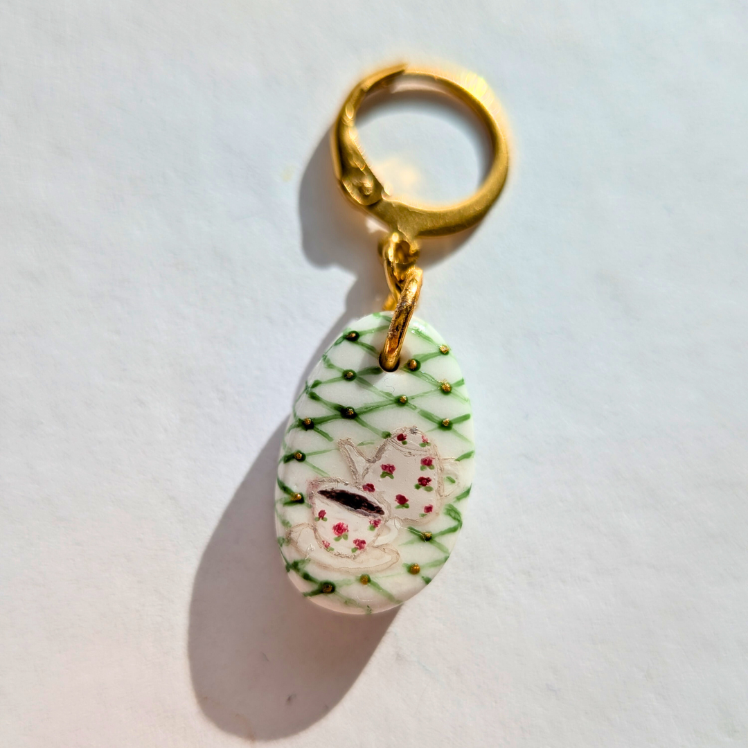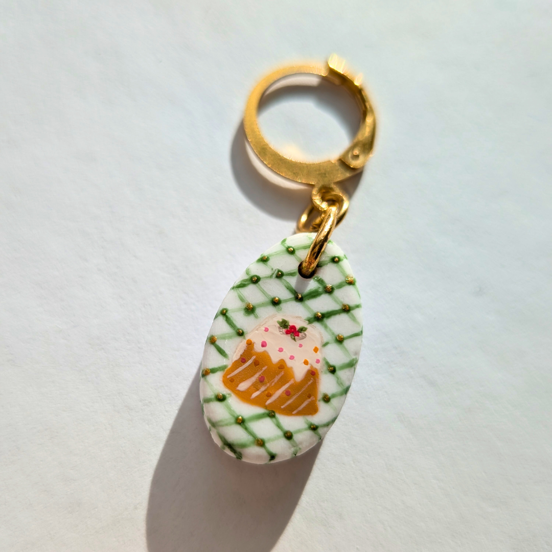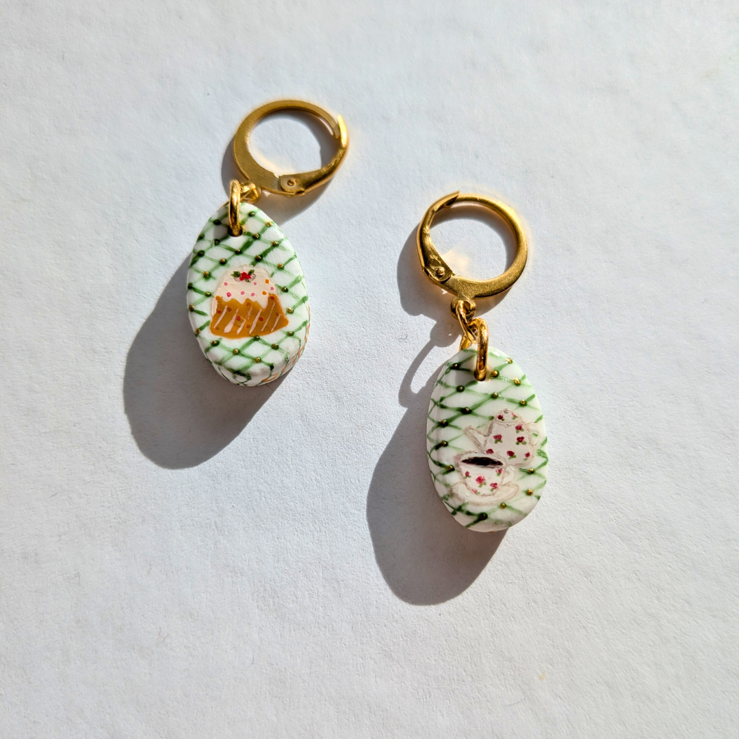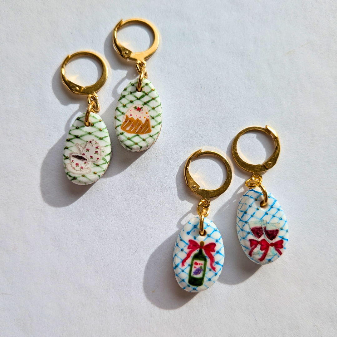 Ces boucles d’oreilles en porcelaine peinte à la main illustrent une scène douce et gourmande : un panettone doré accompagné d’une petite théière, symboles de chaleur et de convivialité pendant les fêtes de Noël.
