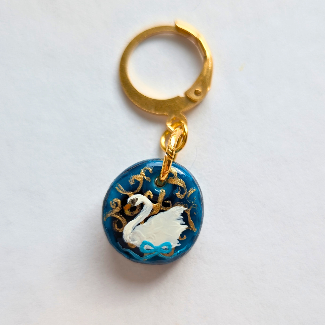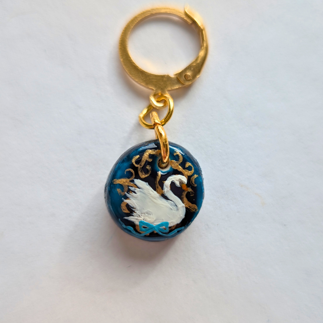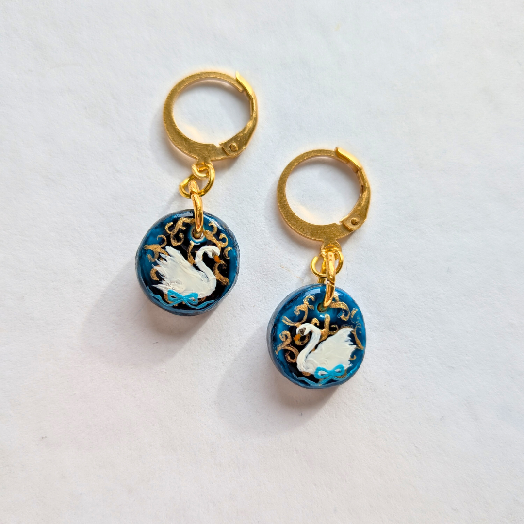Ces boucles d’oreilles délicates en porcelaine peinte à la main représentent deux cygnes gracieux ornés d’un ruban bleu, symboles de pureté et d’amour. Leur design raffiné fait écho au pendentif assorti, créant un ensemble harmonieux et poétique.