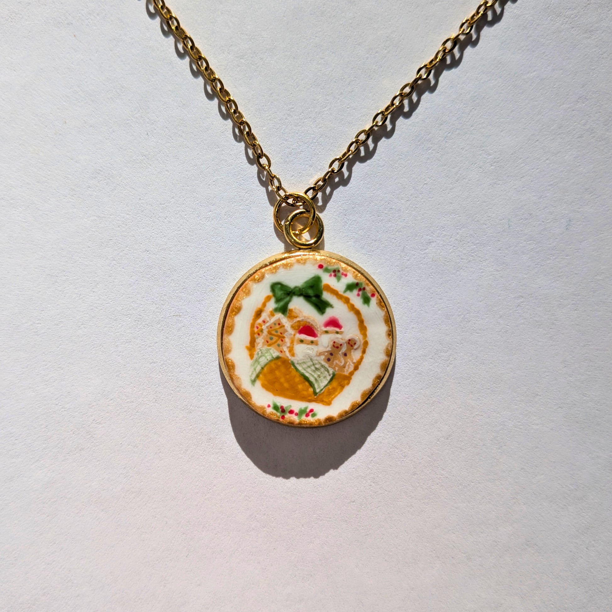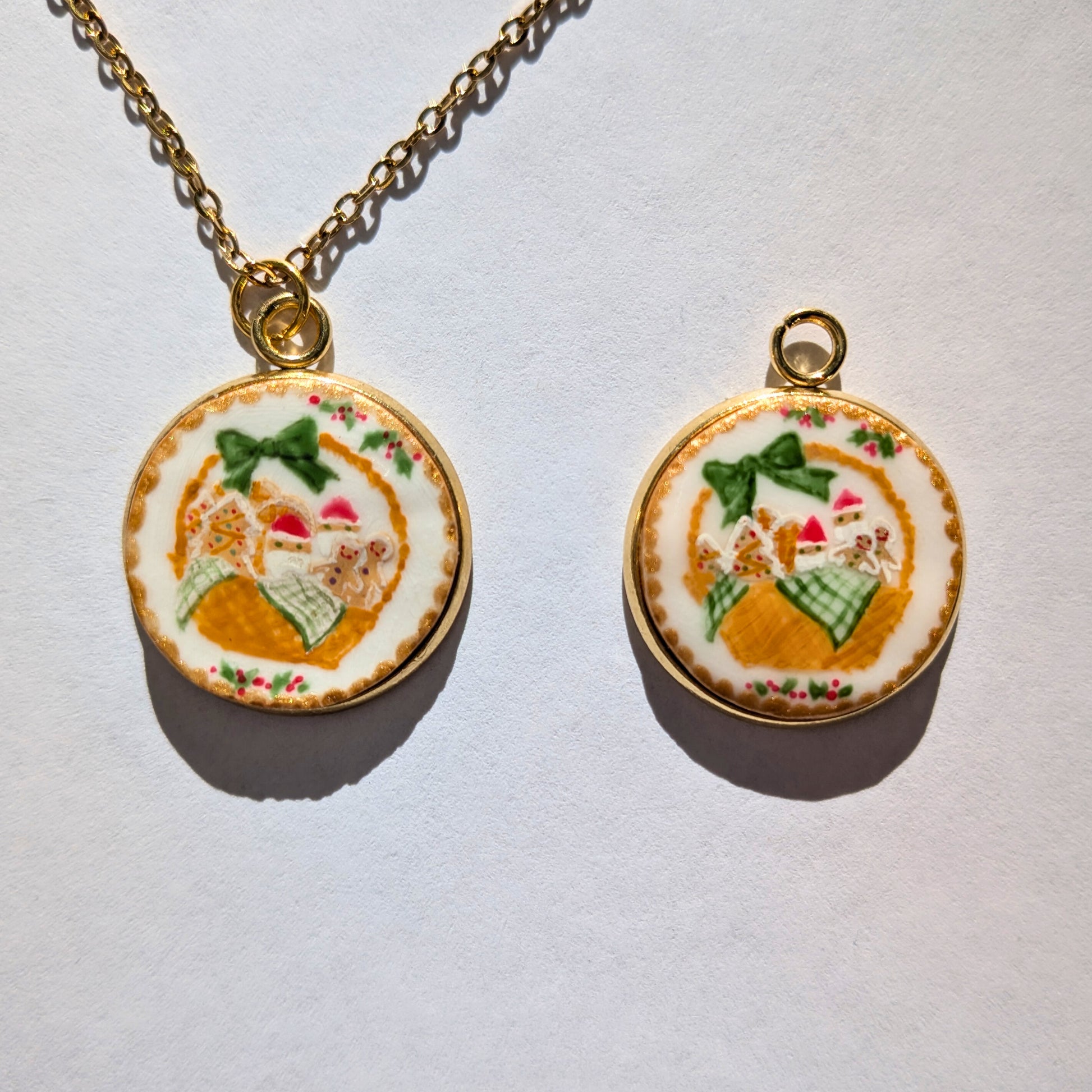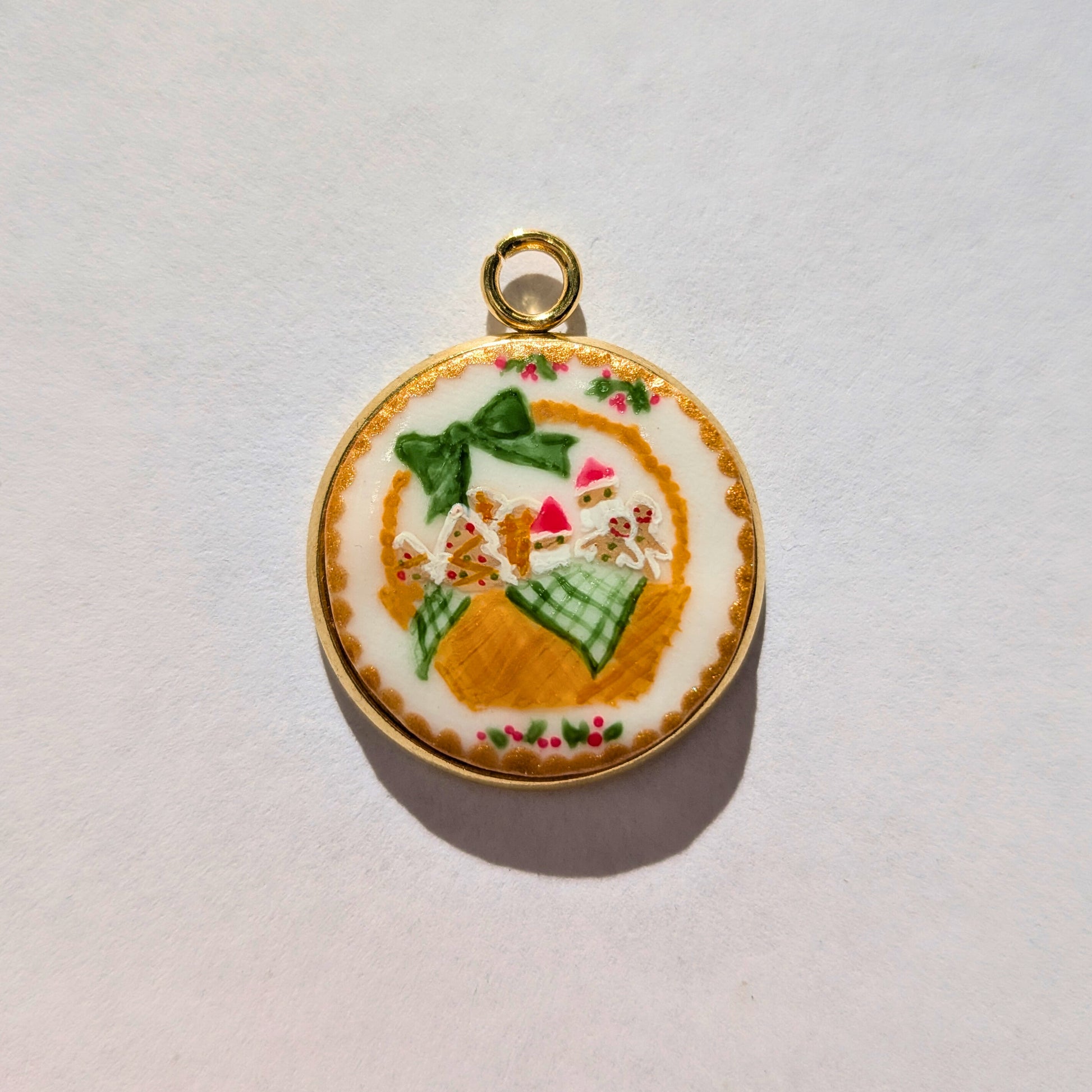 Ce pendentif en porcelaine dépeint un petit panier garni de biscuits dorés, évoquant la chaleur d’un goûter partagé et le charme des douceurs faites maison. Chaque détail est minutieusement peint à la main, offrant une pièce unique pleine de tendresse et de nostalgie.