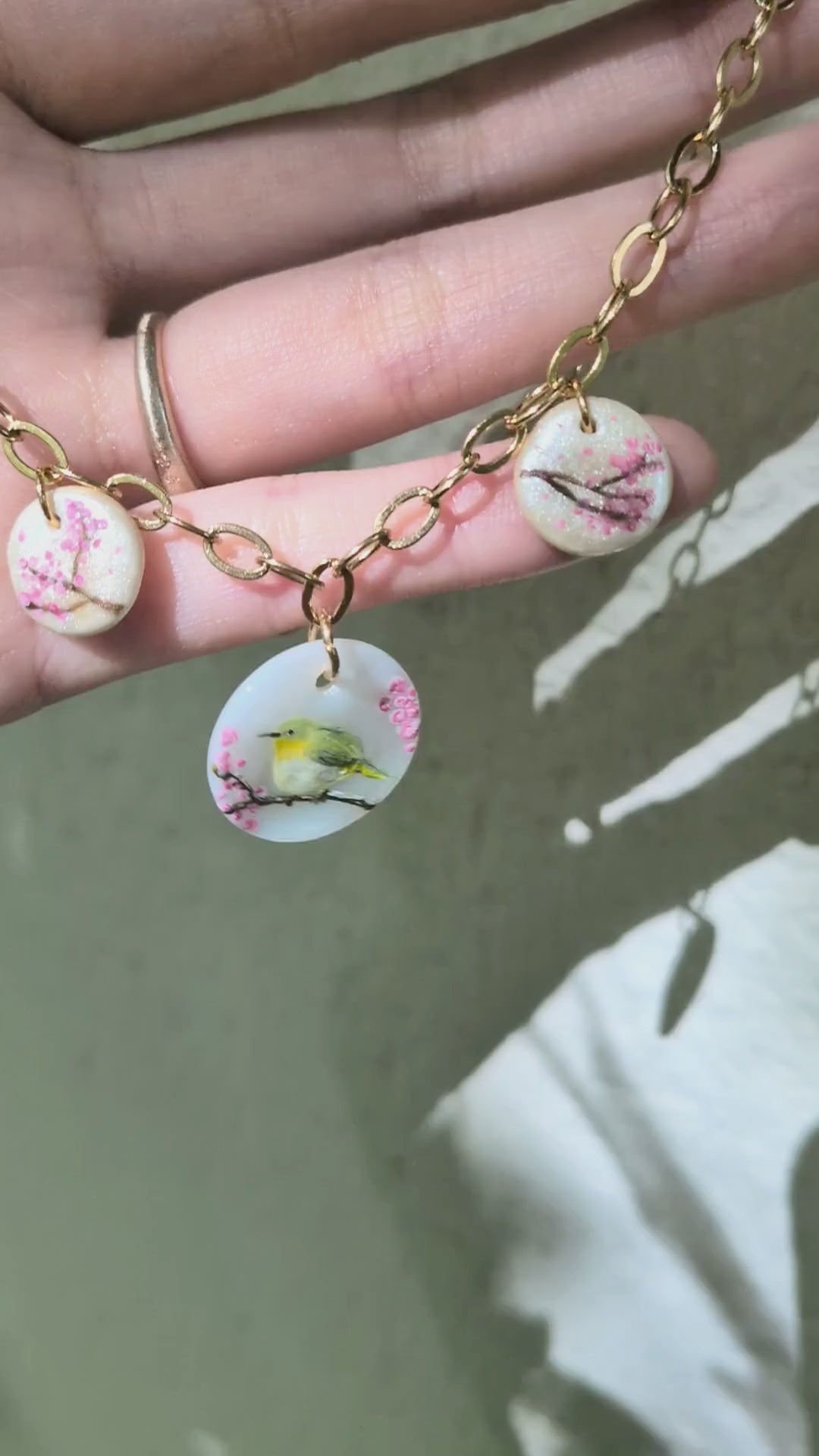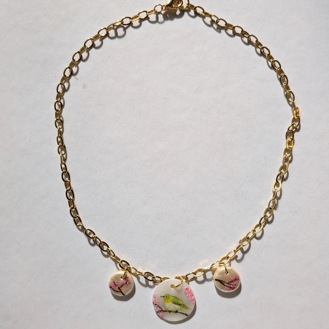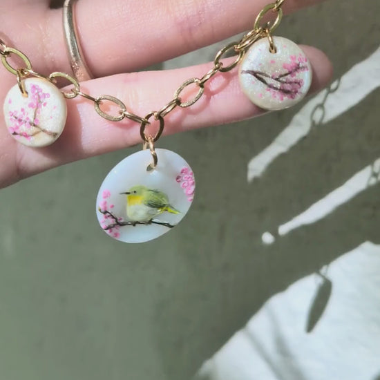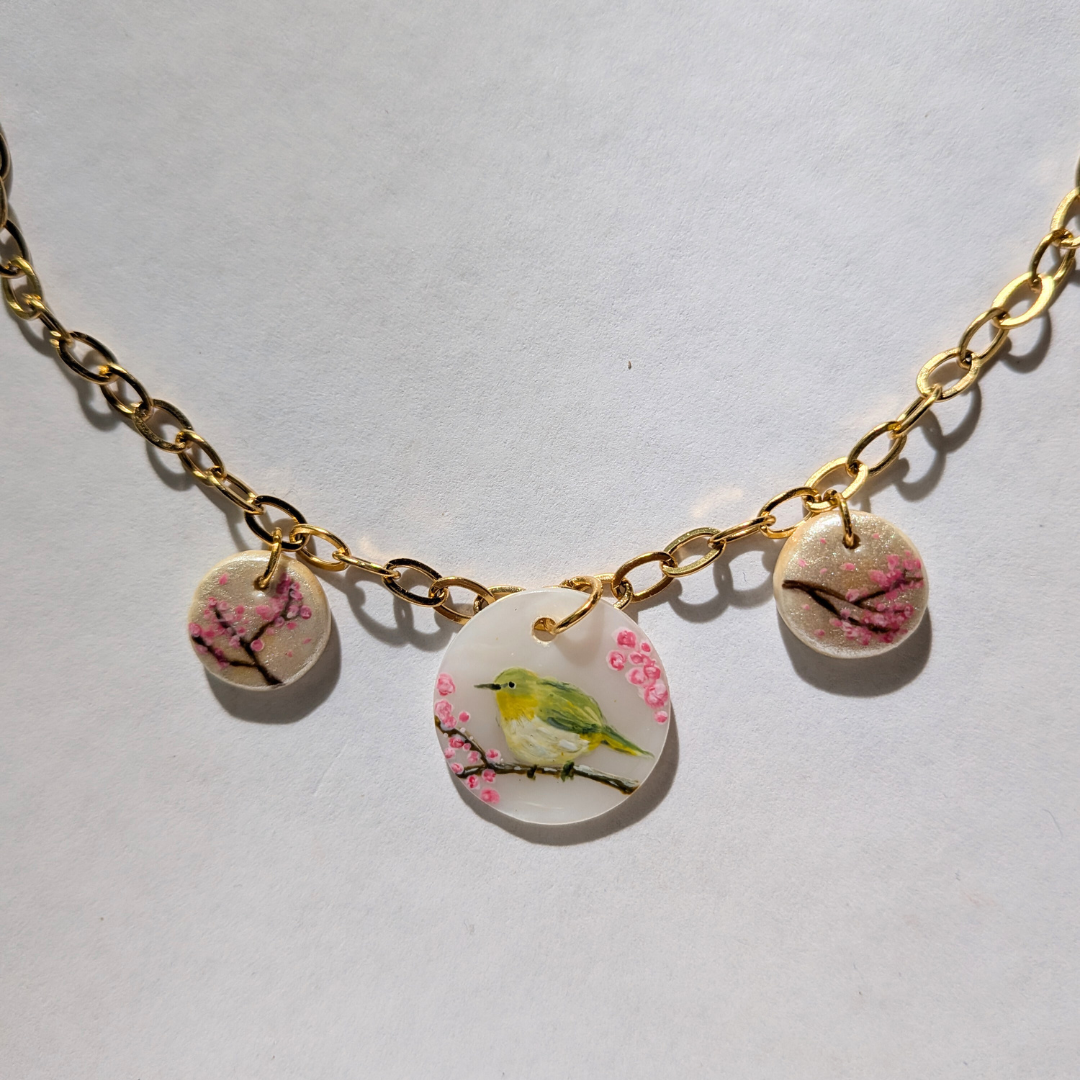 Ce pendentif raffiné en nacre et porcelaine peinte à la main illustre un paysage japonais empreint de poésie : au centre, un rossignol posé sur une branche de prunier, et de chaque côté, des cerisiers en fleurs. Une miniature délicate qui capture l’esprit du printemps et apporte une touche élégante et saisonnière à votre style.