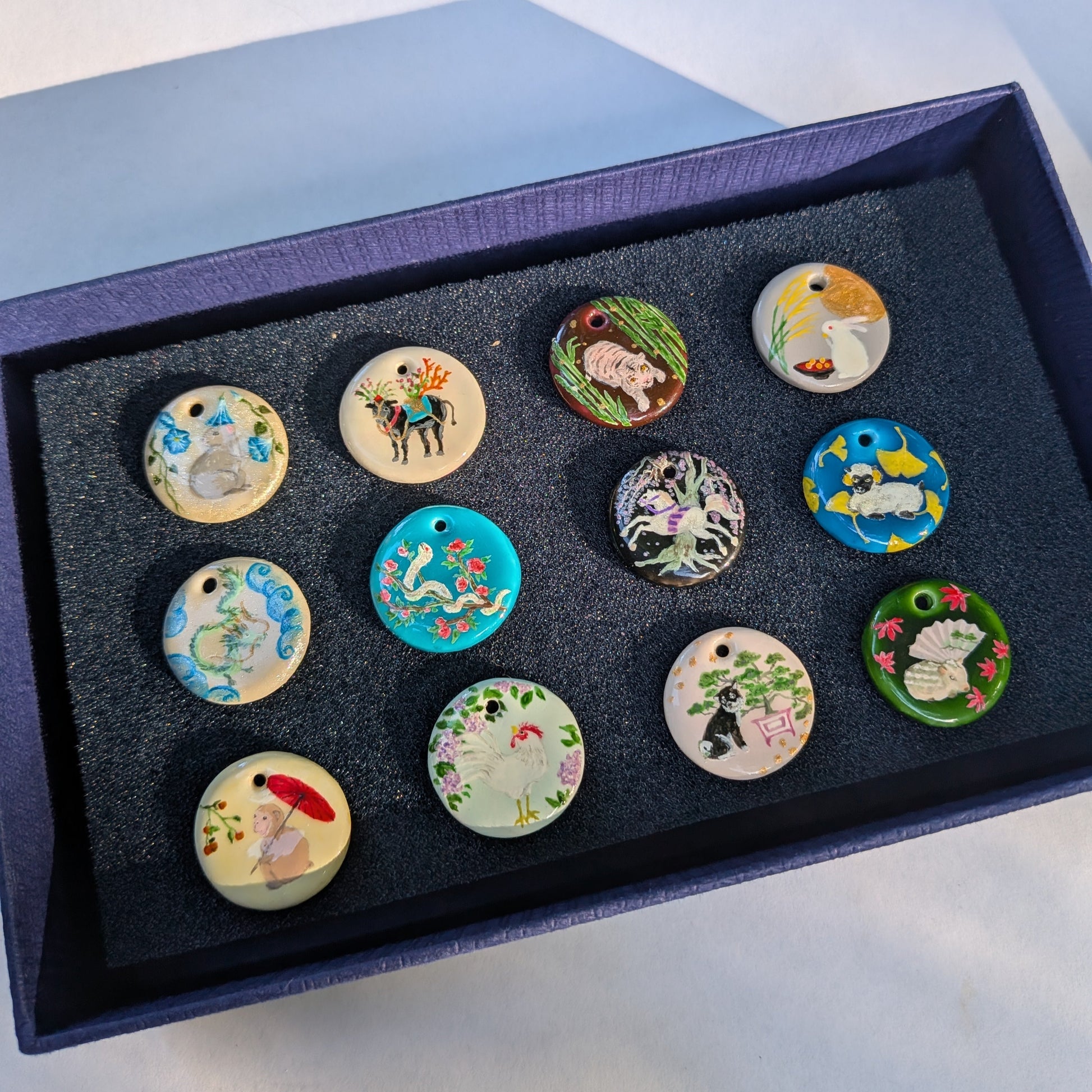 Ce pendentif en porcelaine peint à la main représente un sanglier, symbole de générosité et d’altruisme. Dans la tradition japonaise, le sanglier incarne la bienveillance et la propension à aider les autres. Au dos du pendentif, le caractère kanji 「亥」 est inscrit pour représenter le sanglier.