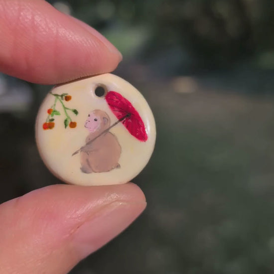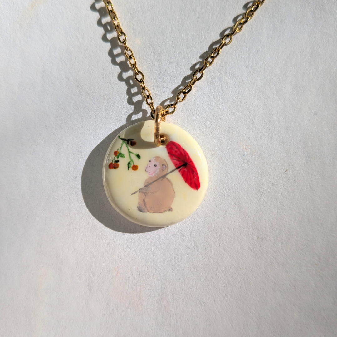 Ce pendentif en porcelaine peint à la main représente un singe, symbole de curiosité et d’intelligence. Dans la tradition japonaise, le singe incarne l’esprit vif, la capacité d’apprentissage et l’enthousiasme pour la découverte. Au dos du pendentif, le caractère kanji 「申」 est inscrit pour représenter le singe.