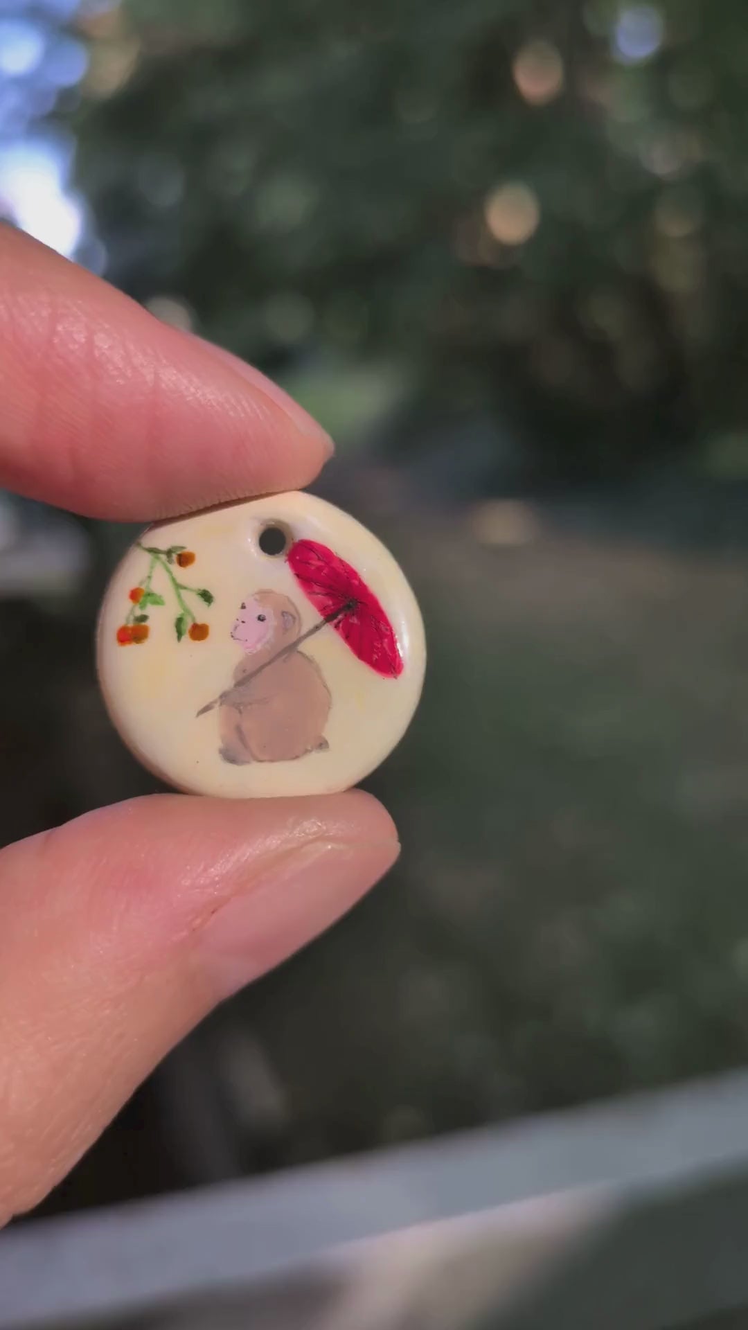 La peinture est cuite au four sur la surface en porcelaine, garantissant des couleurs durables qui ne s’écaillent pas. Toutefois, il est recommandé de ne pas porter ce bijou sous la douche ou lors d’activités physiques intenses afin de préserver sa qualité.